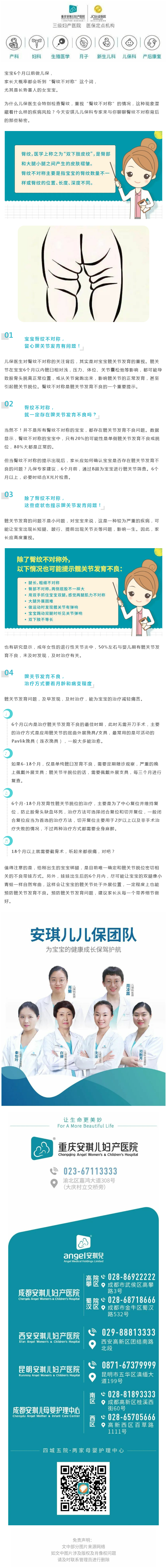 主页 > 走进Angel > 医院新闻 > “臀纹不对称”要紧吗?听安琪儿儿保专家来跟你聊聊 2020-05-28 10:57 154 上一篇:疼痛不是妈妈的标签,“为母则刚”之前别忘了“女子本柔弱” 下一篇:吃了碘盐还需要补碘吗?小心孕期缺碘影响宝宝智力 相关阅读/reading 【方舟之家•安琪儿计划】与你携手,让 五年同行 医路相伴丨不孕不育专家颜耀华 安琪儿准爸妈音乐学院第十七期 “生命的 疼痛不是妈妈的标签,“为母则刚”之前 怀孕13周发现瘢痕妊娠!安琪儿妇科团队 相关科室/The relevant departments 产科 月子 妇科 新生儿 儿保 生殖医学