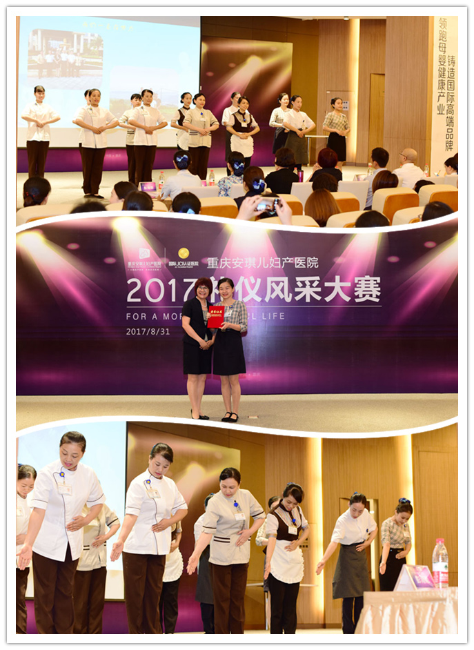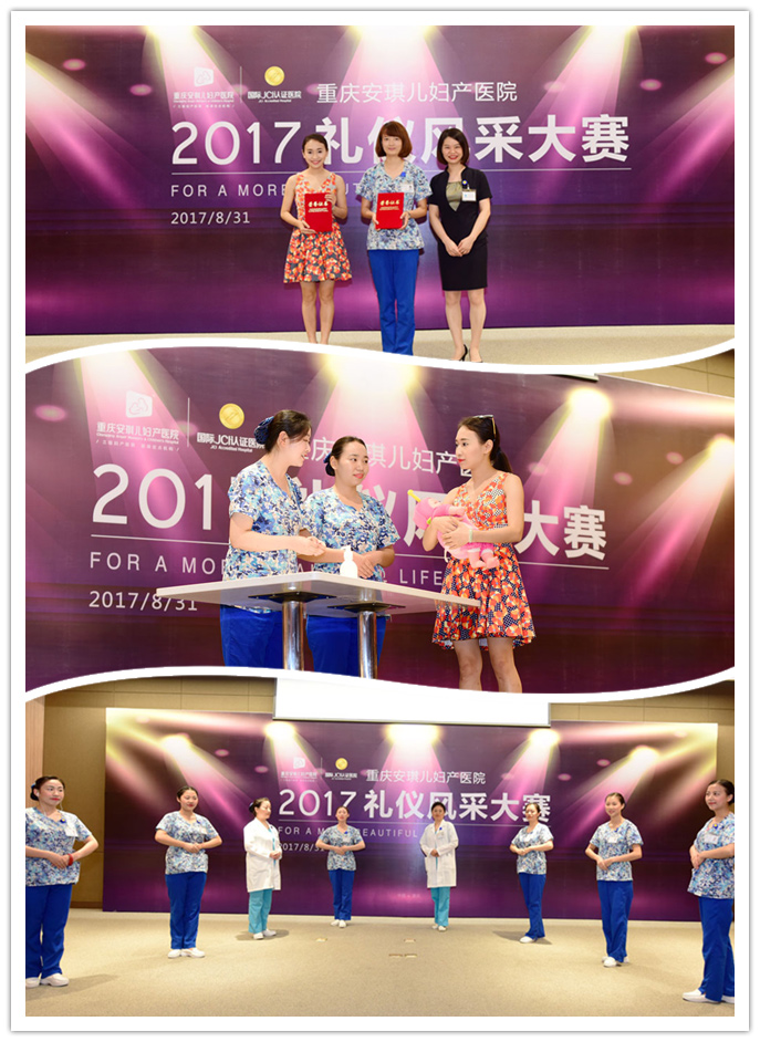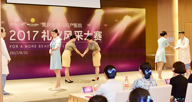 为进一步提升医疗服务品质,关注和满足客户需求,提升客户的就医体验,展现安琪儿规范服务标准日常化的精神风貌。2017年8月31日,重庆安琪儿妇产医院在院内举办了首届“礼仪风采大赛”。安控集团董事、医院运营总经理黄国强,安控集团运营长刘淑琴,医院院长陈启,安控集团服务品质部经理侯辰等出席大赛,并在比赛中担任评委。