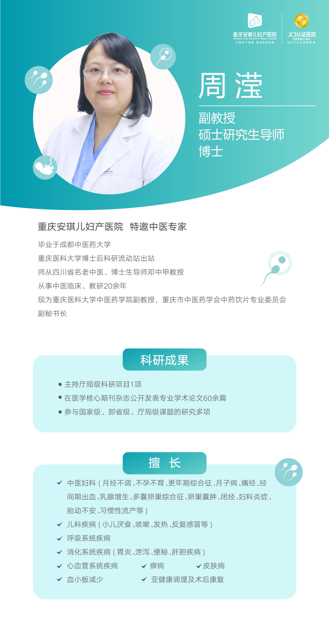 安琪儿生殖医学中心在现代医学的基础上,加入中医方案,邀在治疗不孕不育方面拥有丰富经验的中医学博士周滢医师加盟,通过中医诊疗方式,为每个求子家庭提供调理备孕、助孕保胎中医良方。