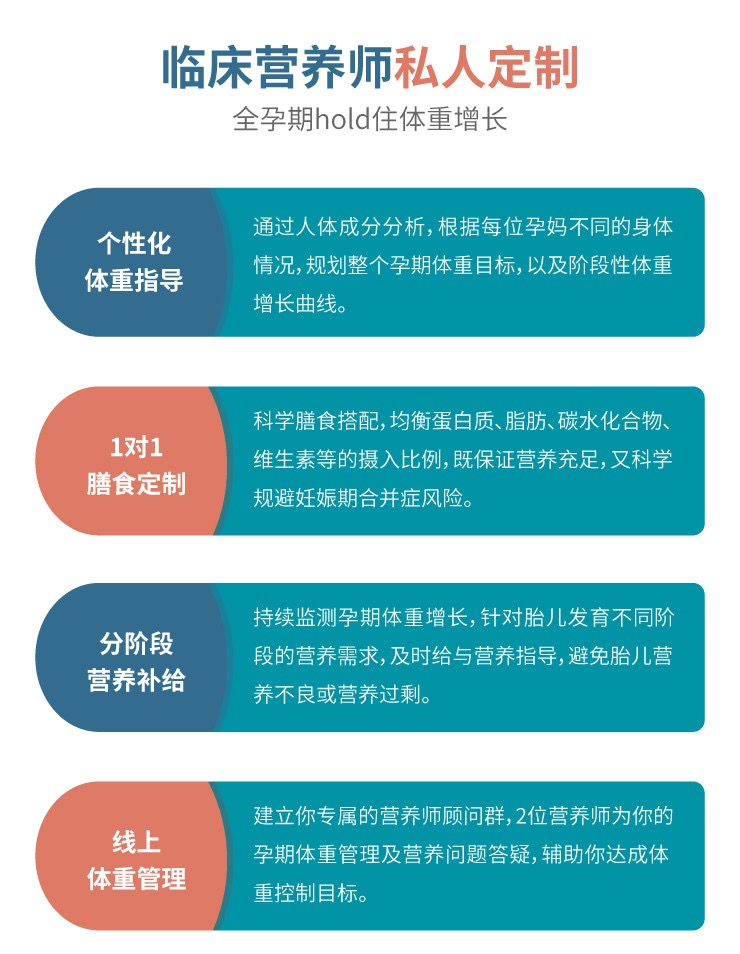 所以,为了帮助孕妈做好孕期营养体重管理,安琪儿营养科贴心推出“全孕期营养体重管理”套餐,由营养师团队私人订制,根据不同体质进行食谱定制、营养指导、体重管理,为母婴饮食营养健康保驾护航。