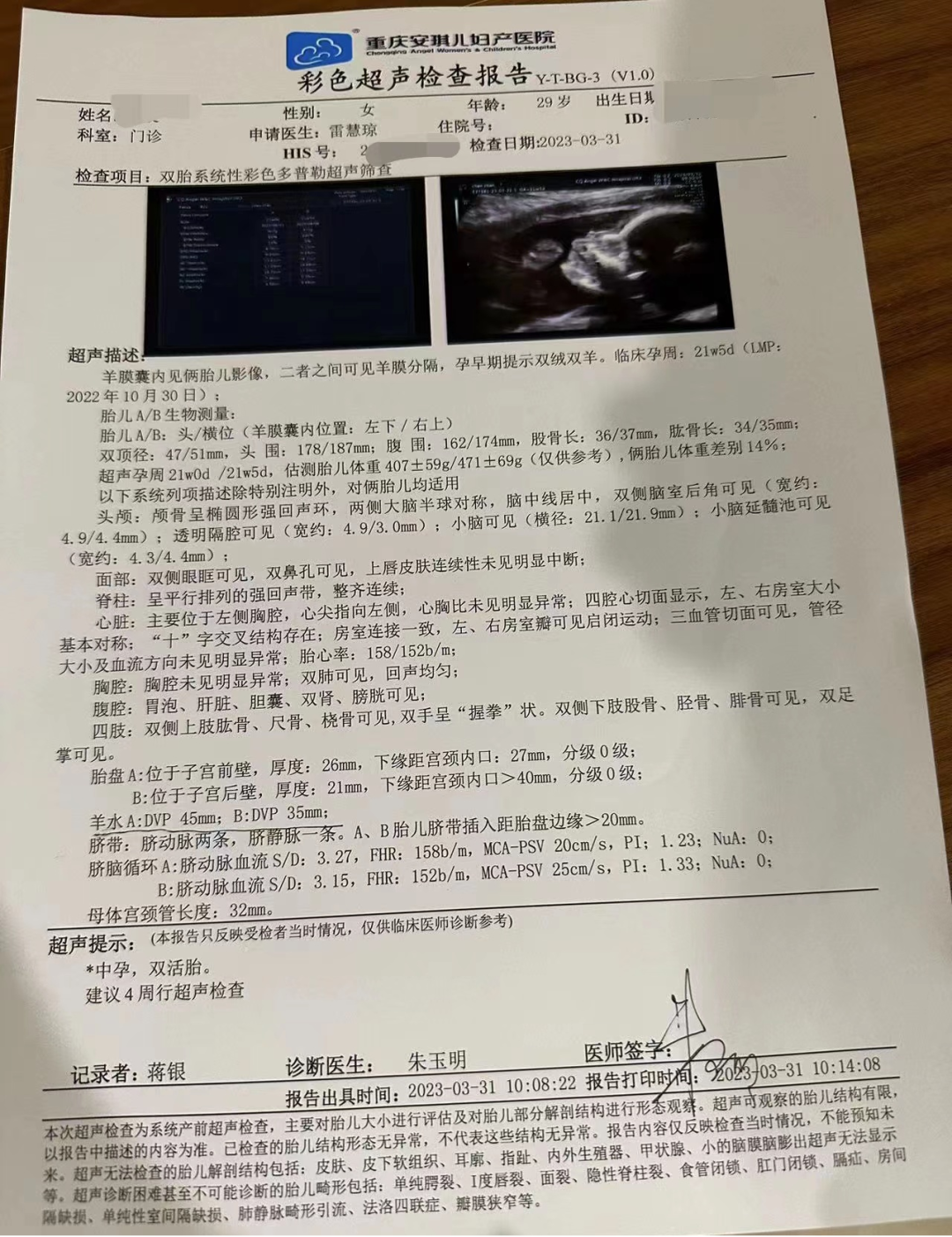目前,孕妈怀孕22周,由于是双胎妊娠,比常规妊娠进行系统四维大排畸的检查时间略提前。此次特地从外地回院进行系统四维大排畸检查,检查由经验丰富的安琪儿超声学科带头人朱玉明操作,检查显示各项指标良好,两个胎宝发育与孕周相符。